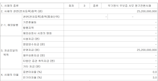 표면이자율은 0%다. 즉 이자 지급이 없다는 뜻인데, 전환사채는 일정 기간이 지나면 발행회사 주식으로 교환할 수 있는 권리가 붙어 있는 채권이기 때문이다. 만기 시에 원리금을 받거나 그 전에 주식으로 바꾸는 선택지가 있다.