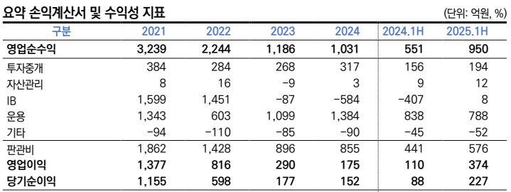 같은 기간 투자중개부문은 156억원에서 194억원으로, 자산관리는 9억원에서 12억원으로 모두 순수익 확대에 성공했다. 운용부문 수익은 838억원에서 788억원으로 감소했으나 여전히 영업순수익 내에서 가장 큰 비중을 차지하고 있다.