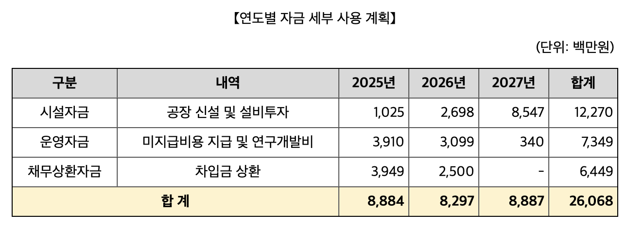 비츠로넥스텍은 이번에 조달을 앞둔 자금 259.6억원 가운데 122.7억원은 공장 신설 및 설비투자 등 시설자금으로, 73.5억원은 미지급 비용 지급 및 연구개발비 등 운영자금으로, 나머지 64.5억원은 채무상환자금으로 사용할 방침이다.