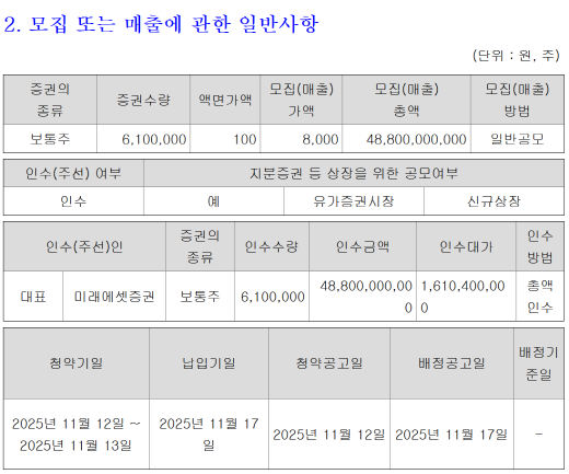 미래에셋증권(037620)이 맡았으며, 청약기일은 오는 11월12일부터 13일까지다.