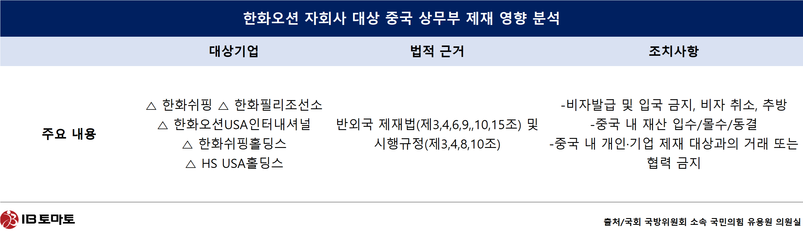 앞서 지난 14일 중국 상무부는 ‘반외국제재법’에 근거해 한화오션과 한화시스템의 미국 자회사인 △ 한화쉬핑 △ 한화필리조선소 △ 한화오션USA인터내셔널 △ 한화쉬핑홀딩스 △ HS USA홀딩스 등 5곳을 제재 대상에 올렸다.