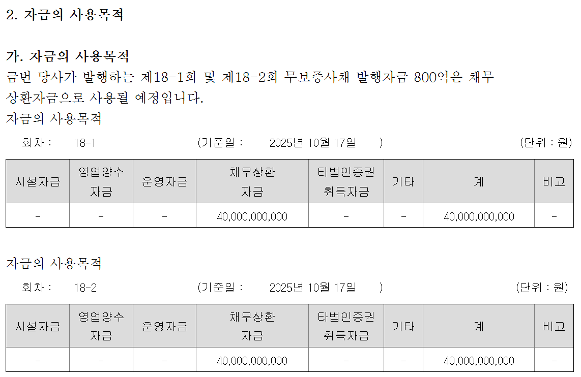 사채 발행자금 총 800억원은 전액 채무상환자금으로 사용될 예정이다. 수요예측 결과에 따라 증액이 결정될 경우 증액분 역시 채무상환자금으로 사용될 예정이다. 채무상환 대상은 지난 2020년 12월 발행한 3000억원 규모의 제4회차 사모사채다. 발행금리는 4%이며, 만기일은 오는 12월3일까지이다.