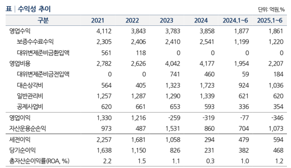 하지만 2022년 이후 국내 건설업 경기가 저하되면서 건설사의 재무적 안정성이 하락하자 대손상각비 등이 늘면서 영업 손실을 기록했다. 상반기에도 준비금 전입액과 대손상각비가 늘어나면서 346억원의 반기 영업손실을 냈다.