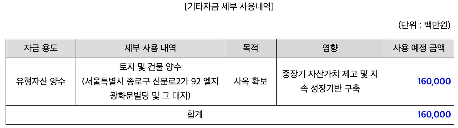 조달 자금은 1600억원은 전액 유형자산 양수에 쓰일 예정이다. 회사는 발행금을 서울 종로구의 LG광화문 빌딩과 그 대지 등을 사옥확보 목적으로 사용한다고 밝혔다.