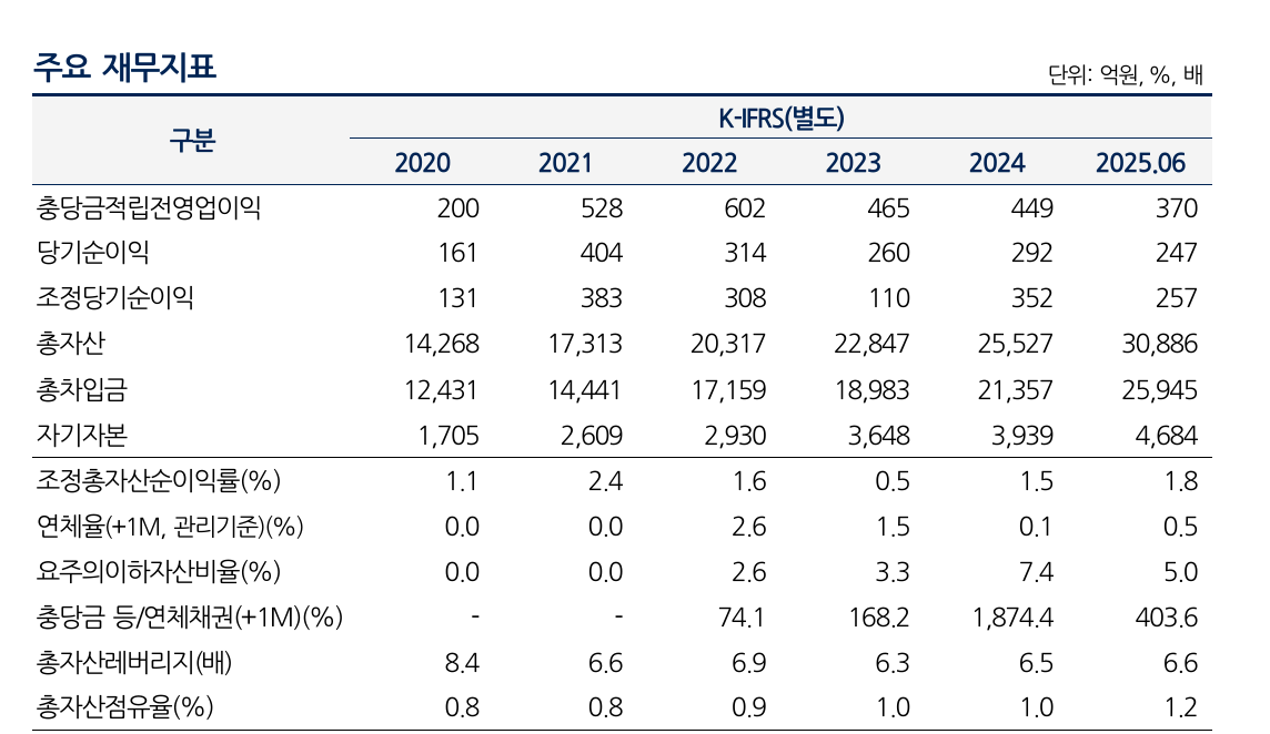 회사의 6월 말 기준 1개월 이상 연체율은 0.5%, 요주의이하자산비율은 5.0%로 전반적으로 양호한 수준을 보였다. 6월 말 기준 요주의이하자산 잔액은 1160억원으로 지난해 부동산PF 사업성평가 반영 영향으로 2023년 말 기준치(550억원) 대비 211% 증가한 수준을 유지하고 있다는 분석이 나온다.