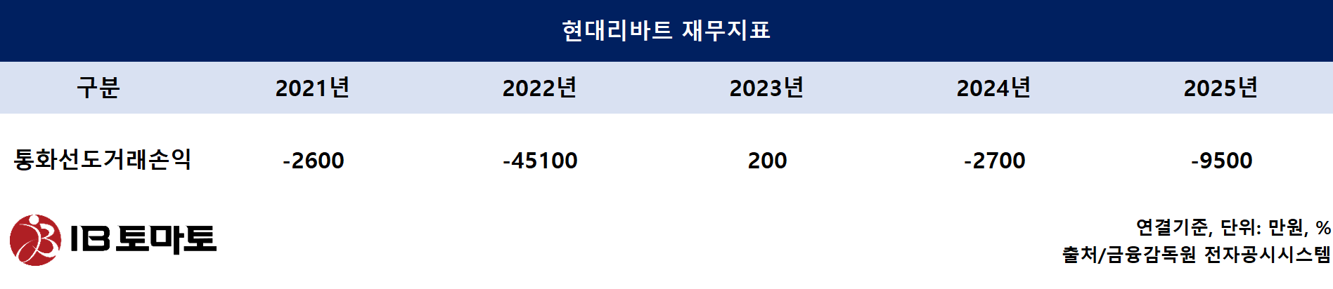 11일 금융감독원 전자공시시스템에 따르면 현대리바트의 통화선도 거래체결현황은 2021년 마이너스 2600만원, 2022년 마이너스 4억5100만원, 2023년 플러스 200만원, 2024년 마이너스 2700만원, 2025년 마이너스 9500만원을 기록했다. 6년간 통화선도 거래로 약 5억9700만원의 손실을 기록한 셈이다.