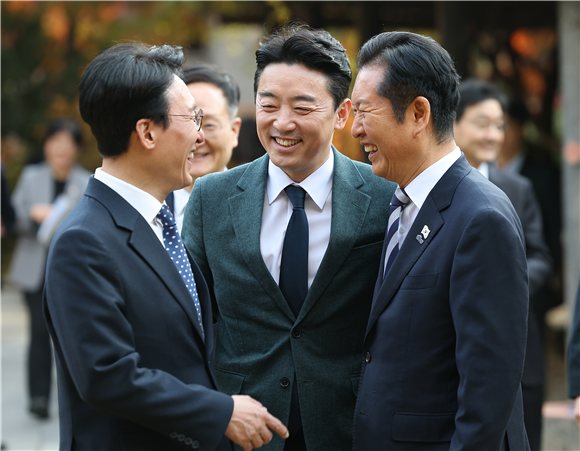 김민석 국무총리(좌)이 강훈식 대통령 비서실장(중), 정청래 더불어민주당 대표(우)와 인사를 나누고 있다. (사진=연합뉴스)