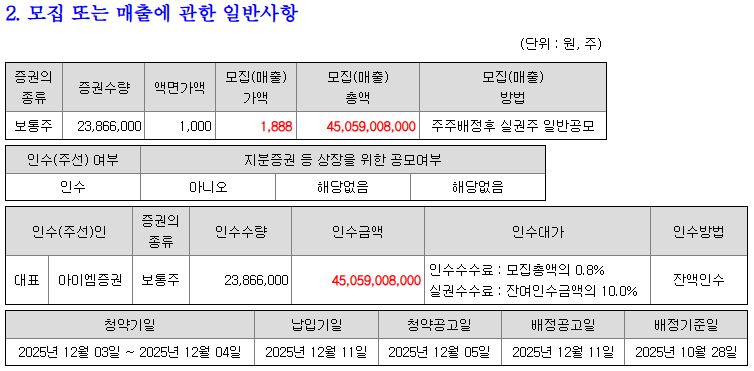 1차 발행가액은 주당 1888원이다. 실제 확정 발행가액은 구주주 청약일인 다음달 1일을 기준으로 3거래일 전 확정될 예정이다. 청약은 구주주를 대상으로 12월3일부터 4일까지 진행되며, 납입일은 12월11일이다. 신주의 상장예정일은 12월26일로 계획됐다. 대표주관은 iM증권이 맡았다.