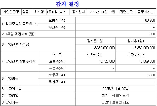 14일 전자공시시스템에 따르면 테라닉스는 이사회 결의를 통해 보통주 16만200주를 감자하기로 했다. 이는 발행주식 총수의 2.38% 규모다. 감자 후 발행주식 수는 감자 전 672만주에서 655만9800주로 감소한다. 소각 대상은 자사주 전량으로, 외부 주주에게 부담이 전가되지 않는 구조다.