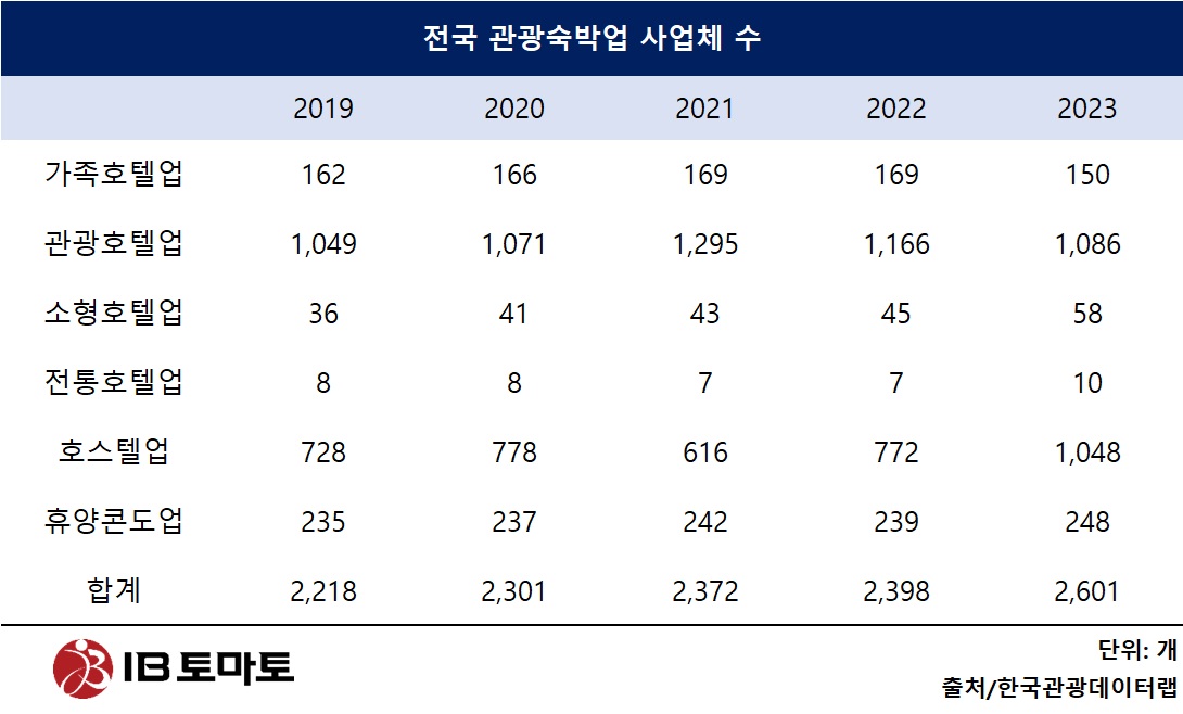 한국관광데이터랩이 공개하는 전국 관광숙박업 사업체 수를 살펴보면, 2021년 2372개에 이르던 사업체수는 2023년 2601개로 늘었다. 하지만 같은기간 관광호텔업은 1295개에서 1086개로 약 200여개 이상 감소하며 호텔 업종 중에서 가장 크게 감소했다. 이어 가족호텔업이 19개 줄어든 것으로 나타났다.