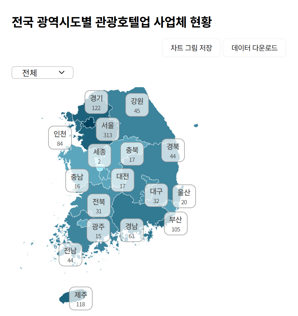 전국 광역시도별 관광호텔업 사업체 현황을 살펴 보면 서울에만 관광호텔 313개가 몰려있다. 이어 경기도 122개, 제주 118개, 부산 105개 순으로 많았다. 가장 적은 곳은 세종으로 관광호텔이 2개에 불과했다. 이어 광주 15개, 충남 16개, 충북 17개, 울산 20개로 양극화가 심각하게 나타났다.
