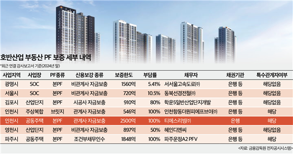 금융감독원 전자공시시스템에 공시된 호반산업의 최근(2024년 말) 연결감사보고서에 따르면 검단 호반써밋 3차 시행은 TS리빙·TS자산개발이 맡고 있으며, 두 회사는 모두 호반산업이 지분 100% 보유한 종속회사다. PF 구조는 보증한도 2500억원, 부담률 100%, 관계사 자금보충 약정까지 얹혀 리스크가 외부로 분산되지 않고 그룹 내부에 직결되는 형태다. 대출잔액만 1210억원이 이미 집행됐다. 즉 검단 호반써밋 3차는 보증 규모가 가장 크고(2500억원), 부담률 100%, 자금보충도 계열 시행사(TS리빙)와 직접 연결된 구조로, 세 가지 위험 요인이 동시에 적용된 유일한 프로젝트다. 이렇듯 PF 구조가 워낙 무거운 사업인 만큼, 분양가 인상 배경에 PF 부담이 작용했을 것이라는 해석도 일부에서 나왔다.