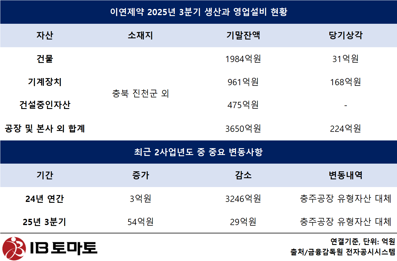 이연제약은 충주공장 준공 이후 2023년 8월 KGMP 인증을 획득하고 2024년 11월 바이오의약품 전문수탁 GMP 인증을 획득해 바이오·케미칼 전문 생산 및 CMO 사업에 박차를 가하는 중이다. 즉, 사측은 관련 인증이 완료된 지난해를 '자산의 사용이 가능한 시점'이라고 보고 신공장에 대한 감가상각을 개시한 것으로 보인다.
