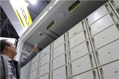 전시된 ESS의 센서를 가리키고 있는 배터리 기업 관계자. (사진=연합뉴스)