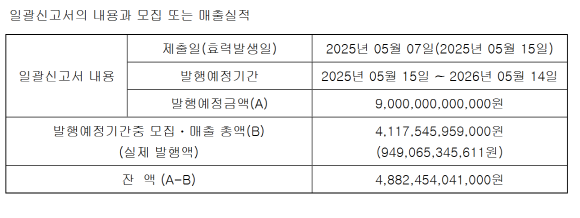 이번 공시 핵심은 일괄신고 방식을 택했다는 점이다. 이는 특정한 증권을 빈번하게 발행하는 곳이 일정 기간의 모집물량을 일괄하여 사전 신고할 수 있도록 한 제도다. 발행 한도가 정해지면 그 안에서 자유롭게 증권을 펴낼 수 있다.
