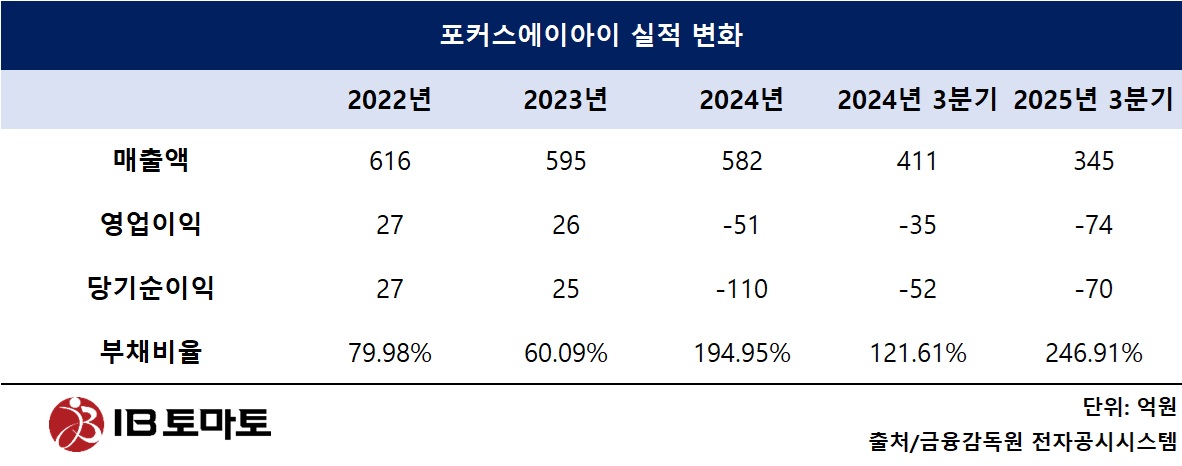 포커스에이아이가 지난 2022년 이후 역성장을 지속해 온 만큼 신성장동력 확보가 절실한 상황이다. 지난 2022년 616억원에 달했던 매출은 2023년 595억원, 2024년 582억원으로 감소했다. 지난해에는 영업손실 51억원을 기록하면서 적자전환했다. 여기에 금융비용 확대와 관계기업투자손실이 반영되면서 당기순손실은 110억원을 기록했다.