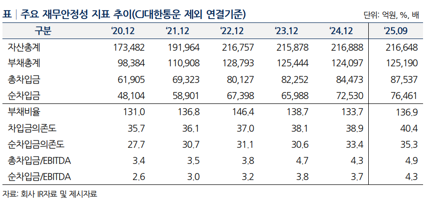 9월 말 CJ대한통운을 제외한 연결기준 부채비율과 순차입금의존도는 각각 136.9%, 35.3%로 우수한 재무안정성 지표를 기록하고 있다. 리스부채 증가, CAPEX 자금소요 대응을 위한 외부차입과 CJ셀렉타 등 매각예정 부채의 재분류 등으로 총차입금과 순차입금 규모는 각각 8조7537억원, 7조6461억원으로 이전 대비 확대됐다. EBITDA 대비 순차입금 지표 또한 4.3배로 상승하며 차입부담능력이 지난해 말 대비 다소 저하된 수준을 보이고 있다.