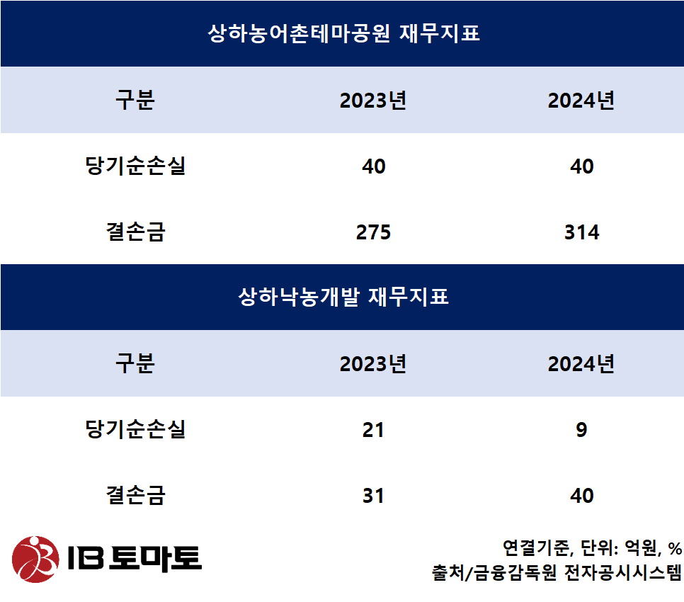 상하농어촌테마공원은 지난 2020년(감사받지 않은 재무제표 기준) 77억원, 2021년 318억원, 2022년 3200만원, 2023년 40억원, 2024년 40억원의 당기순손실 기록했다. 상하낙농개발의 당기순손실은 2022년 7억원, 2023년 21억원, 2024년 9억원이다.