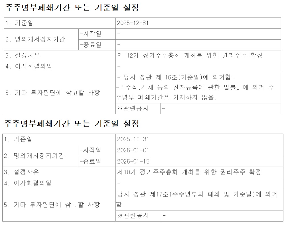그런데 동일한 기준일을 설정한 두 회사의 공시를 살펴보면 한 가지 차이점이 눈에 띈다. 나무기술은 오는 2026년 1월 1일부터 15일까지를 명의개서정지기간, 즉 주주명부 폐쇄기간으로 정했지만, 엑셈은 명의개서정지기간 설정 없이 기준일만 설정해 공시했다.