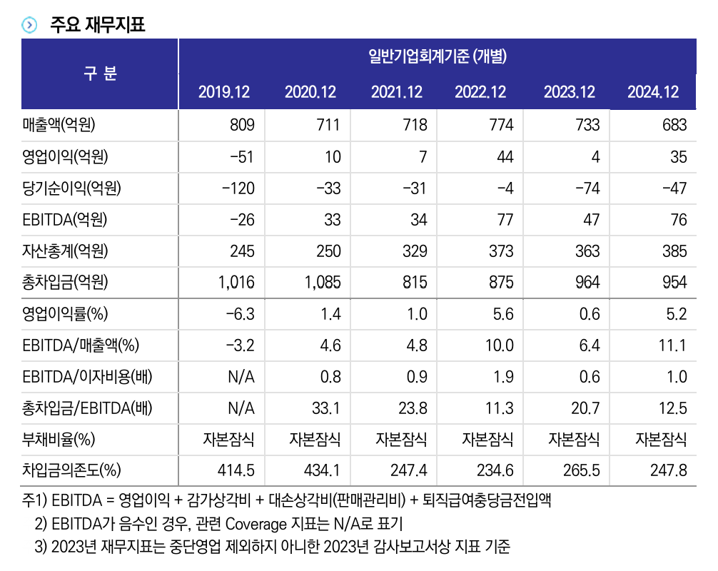 다만 회사는 금융비용 부담 등으로 당기순손실이 지속되고 있는 상황이다. 올해 9월 말 기준 총차입금은 1159억원에 달한다. 2019년부터 지난해까지 회사는 자본잠식 상태에 놓여 있으며, 차입금의존도도 지난해 247.8%를 기록했다.