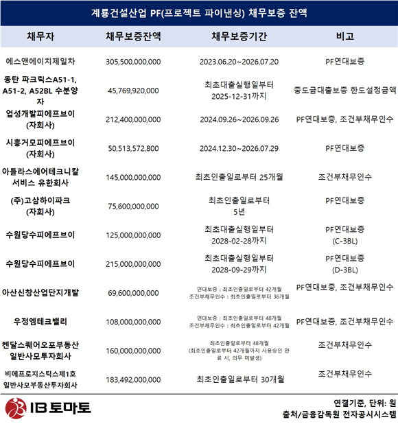 사업장별로 뜯어보면, 수원당수피에프브이를 제외하면 대부분 물류센터·산업단지·지식산업센터 등 산업형 PF로 구성돼 있으며, 구조 역시 준공 이행을 전제로 한 조건부 보증 비중이 높다.
