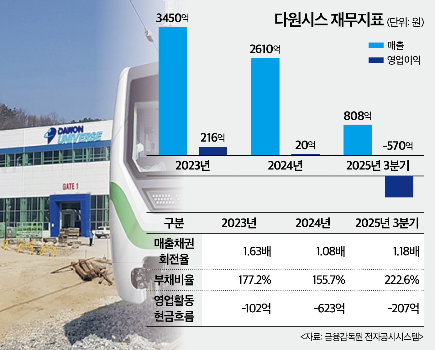16일 금융감독원 전자공시시스템에 따르면 올해 3분기 다원시스의 누적 매출액은 별도기준 808억원, 영업손실 570억원을 기록했다. 지난해 3분기와 비교했을 때 매출(1955억원)은 절반 이하로, 영업이익(73억원)은 큰 폭의 적자로 전환됐다. 매출 급감의 원인은 철도 납품 지연에 따른 수주 잔고의 매출 인식이 지연이 원인인 것으로 보인다.