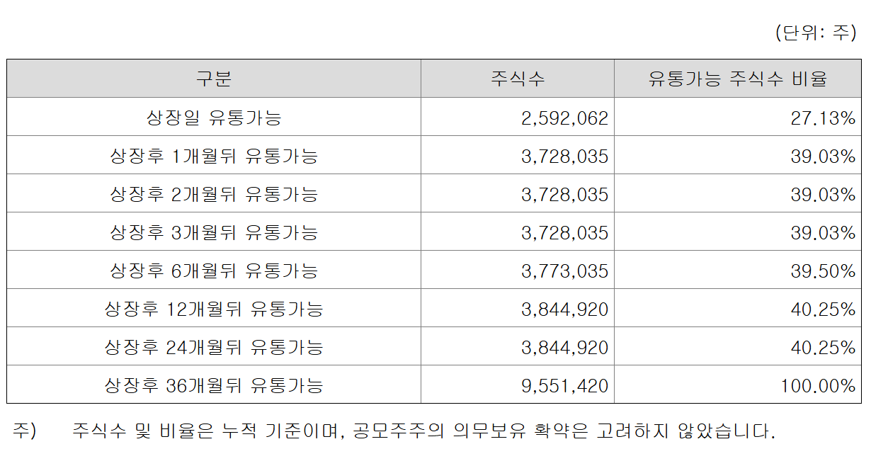 에이스톤벤처스, NH투자증권, 하랑기술투자, 브릿지인베스트먼트 등 대부분의 FI 보유지분에는 1개월 락업이 있다. 상장 후 한달 뒤인 새해 1월11일 회사 주식 유통가능 물량 비율이 전체주식의 27.13%에서 39.03%로 늘어난다. 상장 후 6개월 뒤엔 유통가능 주식수 비율은 39.5%로 확대되고, 1년 뒤엔 40.25%로 증가한다. 상장 후 3년 뒤 모든 물량이 시장에 풀릴 수 있다.