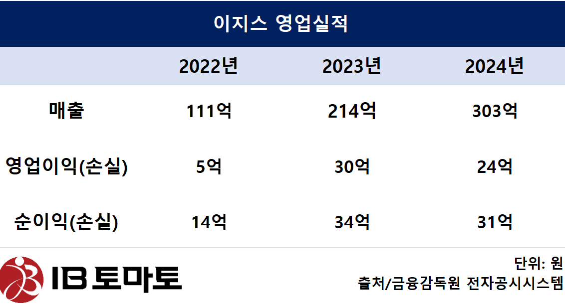 이지스는 최근 3년간 점진적으로 매출 성장세를 기록했으나 지난해 영업실적 지표는 소폭 악화됐다. 최근 3년 매출은 2022년 125억원→2023년 214억원→2024년 303억원으로 올랐다. 이지스의 지난해 매출은 전년 동기 대비 41.4% 증가했지만, 영업이익은 20.5% 감소한 24억원을 기록했다.