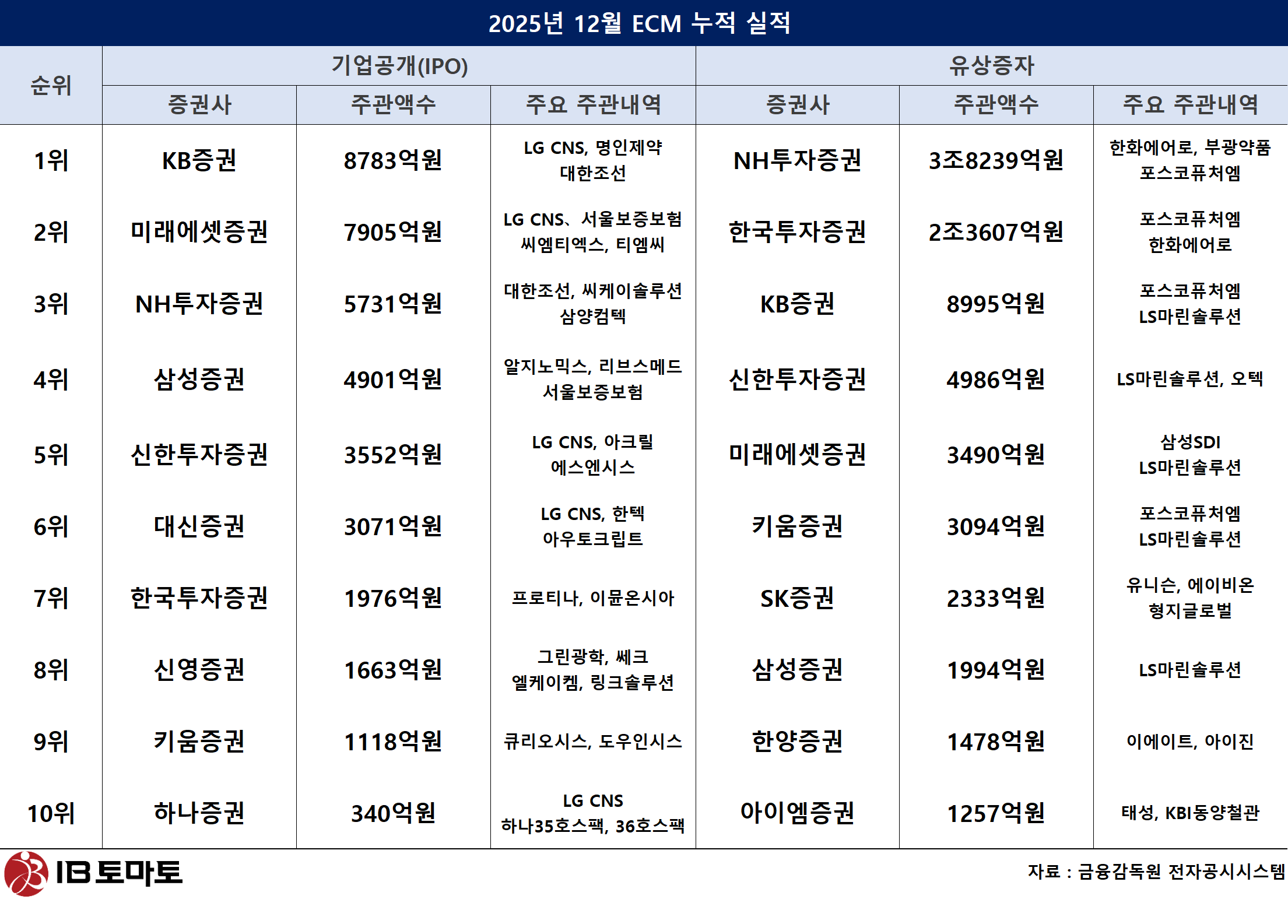 <IB토마토> 집계에 따르면 2025년 연간 IPO 주관 실적 1위는 KB증권이다. KB증권은 대형 딜을 중심으로 한 선택과 집중 전략을 통해 총 8783억원의 주관 실적을 기록하며 2024년에 이어 2년 연속 정상에 올랐다.