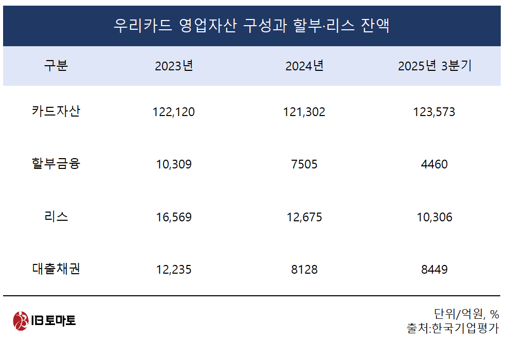 13일 여신전문금융 업계에 따르면 우리카드는 지난해 3분기 기준 할부금융, 리스 자산이 1조4766억원이다. 앞선 2024년 말 2조180억원 대비 26.8%(5414억원) 감소했다. 전체 영업자산에서 할부·리스가 차지하는 비중은 13.5%에서 10.0%로 3.5%p 하락했다.