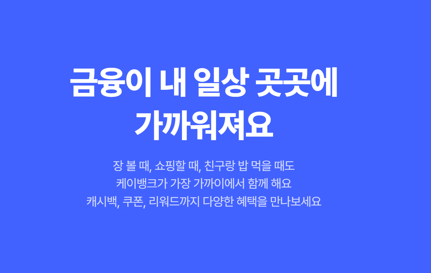케이뱅크는 2016년 설립된 인터넷전문은행이다. 비대면 기반의 금융 상품과 서비스를 제공하고 있다. 수신상품은 일반적인 예적금 상품 외에 생활통장과 플러스박스, 챌린지박스 등이 있다. 여신상품은 신용대출, 마이너스통장, 주택담보대출, 개인사업자대출, 자동차대출 등을 제공하고 있다. 이 밖에도 다양한 분야 파트너 제휴를 기반으로 증권계좌, 신용카드 등 서비스를 제공 중이다.