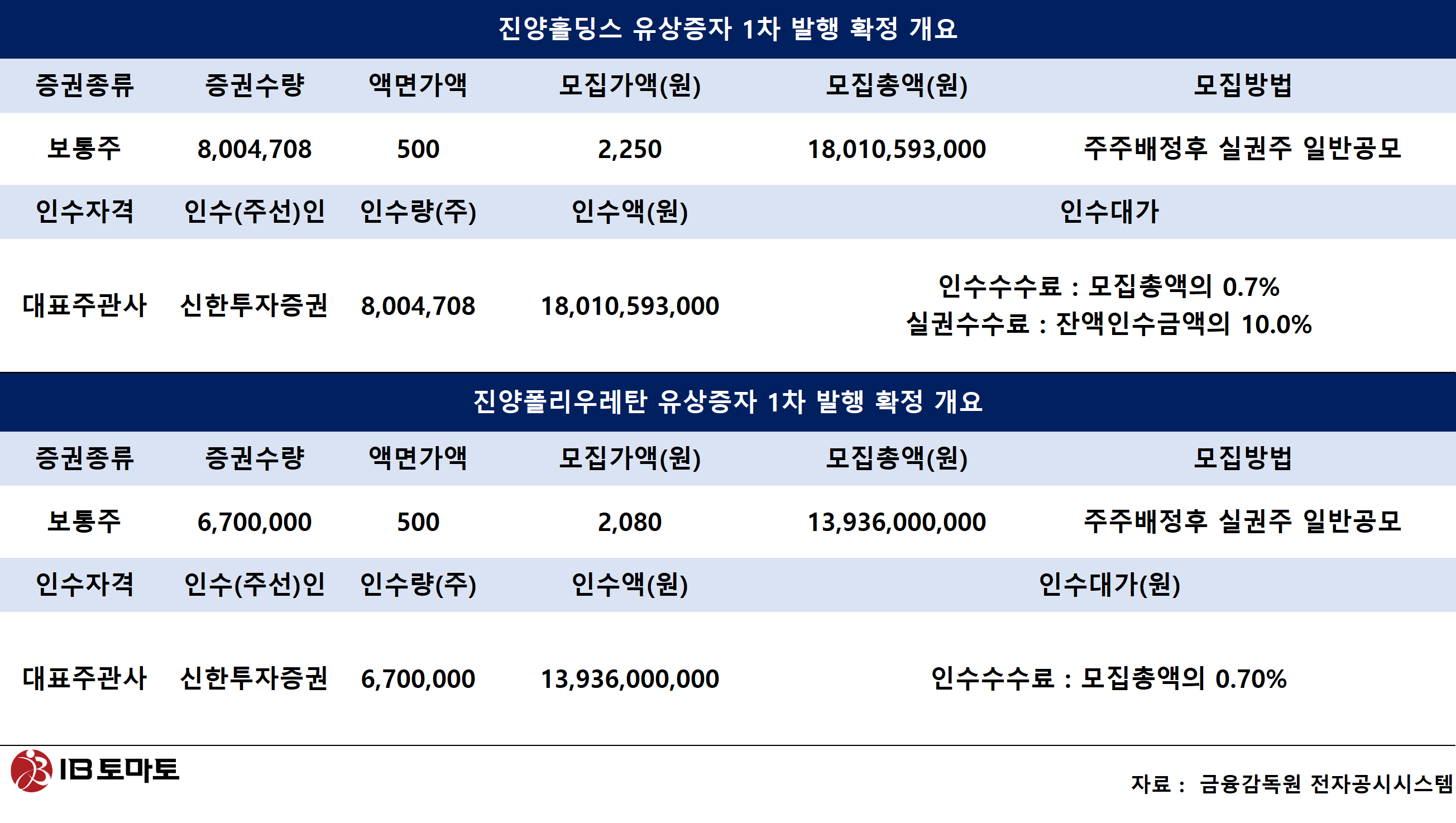 진양폴리(010640)우레탄은 유상증자 1차 발행조건을 확정지었다. 진양홀딩스는 총 800만주의 신주를 발행해 180억원, 진양폴리우레탄은 총 670만주의 신주를 발행해 140억원을 조달할 수 있게 됐다.