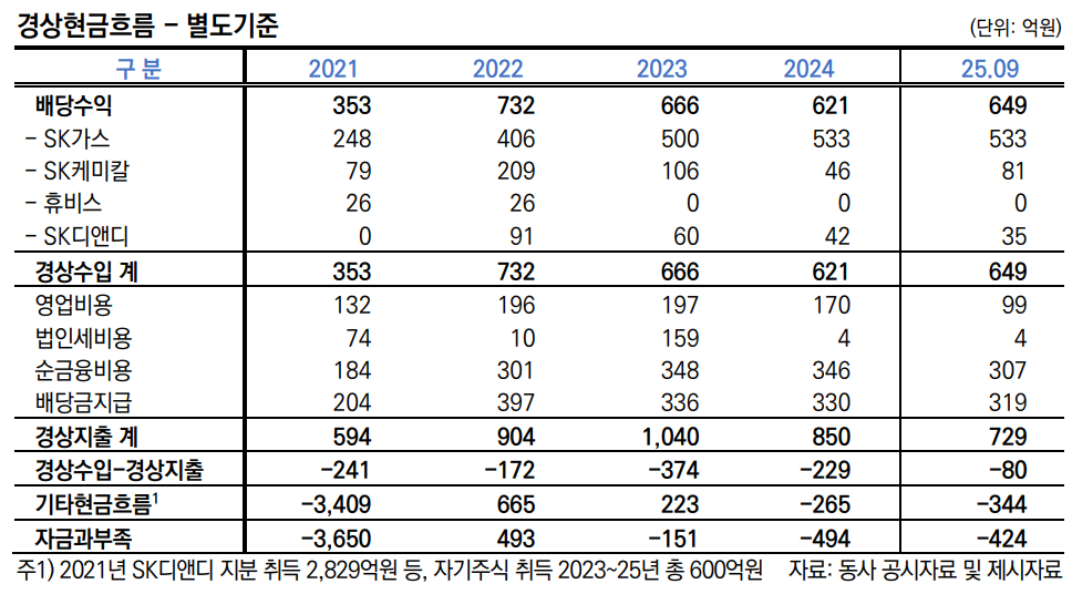 별도 기준 배당수익은 2022년 732억원 이후 2023년 666억원 2024년 621억원 지난해 3분기 기준 649억원으로 안정적인 흐름을 이어가고 있다. 특히 SK가스가 연간 500억원 이상 배당을 지속하며 핵심 현금 창구 역할을 하고 있다.