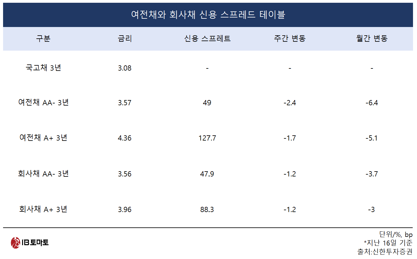 여전채 스프레드는 올해 초부터 빠르게 축소하고 있다. 주간 스프레드 변동이 AA-급은 –2.4bp, A+급은 –1.7bp였다. 월간 스프레드 변동은 각각 –6.4bp, -5.1bp다.