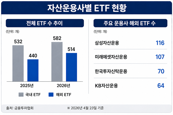 운용사별 해외 ETF 수는 삼성자산운용 116개, 미래에셋자산운용 107개, 한국투자신탁운용 70개, KB자산운용 64개 등으로 집계됐다.