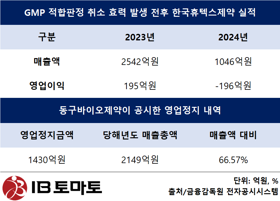 약사법에 따르면 의약품 등을 제조해 판매하려는 제조업자는 제형 또는 제조방법별로 GMP에 적합하다는 식약처의 판정을 받아야만 한다. 즉 GMP 적합판정이 취소된 제조소에서는 의약품 제조 자체가 금지되는 셈인데, 현재로서는 휴텍스제약과 동구바이오제약의 사례를 통해 이 부담의 크기를 수치로 가늠해 볼 수 있다.