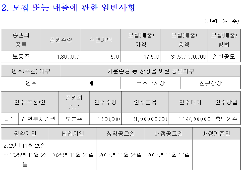 이번 기업공개(IPO)에서는 일반 공모로 보통주 180만주를 발행해 총 315억원을 모집한다. 100% 신주모집으로 진행되며, 대표주관회사는 신한투자증권이 맡았다. 청약기일은 오는 11월25일부터 26일까지다.