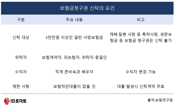 신탁 대상을 사망보험금 청구권에 한정하고 있는 이유는 사망보험금이 금전채권 성격인 보험금 지급의 확정성을 가장 확실하게 갖추고 있어서다. 향후 보험금이 지급될 것이라는 확신이 있는 상품에 대해서만 신탁 서비스가 가능하다는 것이다.