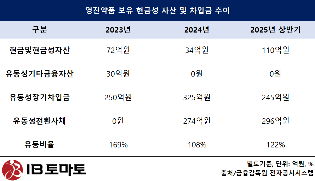 뿐만 아니라 영진약품은 상당한 규모의 차입금 상환 부담을 안고 있는 상황이다. 올해 반기말 기준 단기차입금은 없으나, 유동성장기차입금이 245억원에 달하는 것으로 집계된다. 동일 시점 보유 현금성 자산은 현금및현금성자산 110억원으로 1년 내 상환해야 할 차입금 규모의 절반 수준에 불과하다.