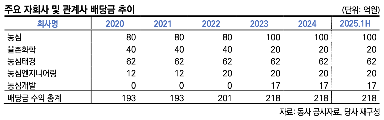 농심홀딩스의 현금창출력은 자회사 배당에 기반한다. 지난해 자회사로부터 받은 배당금 총액은 218억으로,