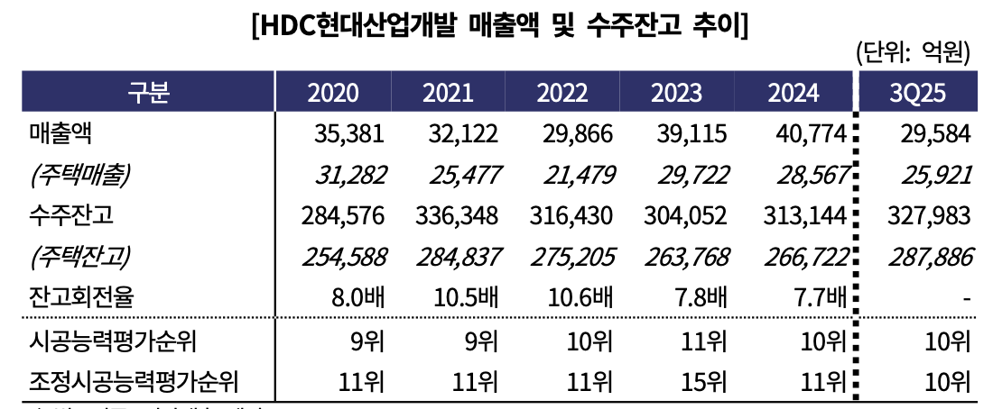 올 3분기 기준 수주잔고는 32.8조원으로 2024년말 대비 1.5조원 증가했다. 3분기 누적 신규수주는 4.4조원이며, 이 중 정비사업 비중이 46.1%에 달한다. 진행 중인 주택사업의 평균 분양률은 97.3%로 높은 수준을 유지하고 있어 향후 1~2년간 매출 가시성이 높다는 평가가 나오고 있다.
