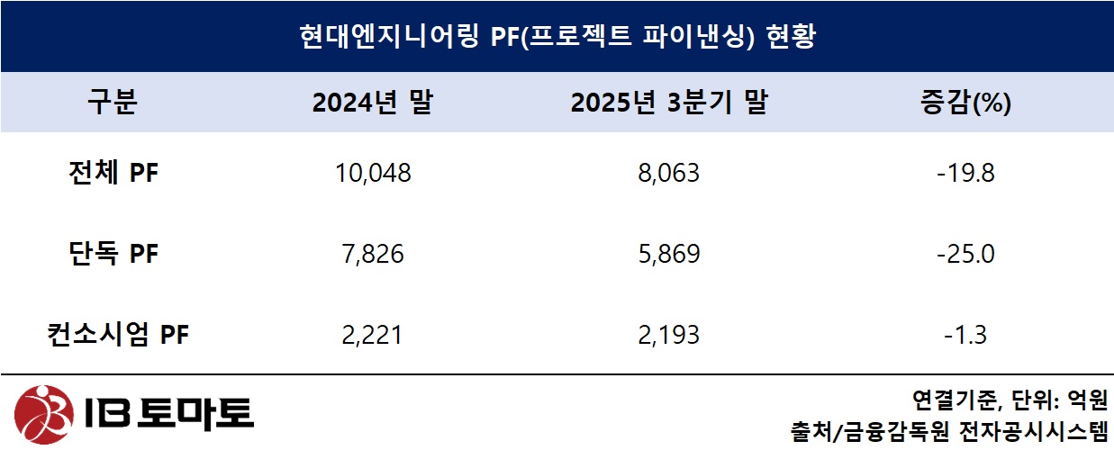 여기에 현대엔지니어링의 전체 PF 부담을 점진적으로 줄어드는 흐름도 영향을 미친 것으로 보인다. 고위험 PF나 브릿지론 중심으로 부담을 정리해온 데다, 올해 상반기 고양의 지식산업센터 사업처럼 사업성이 낮다고 판단될 경우 선제적으로 리스크를 반영하는 전략을 채택하면서 전체적인 PF 위험을 자체적으로 축소하는 방향으로 움직여 왔다. 이는 장부상 우발채무는 남아 있어도 실제 현실화 가능성은 작아지는 구조로 넘어가고 있다는 진단이다.