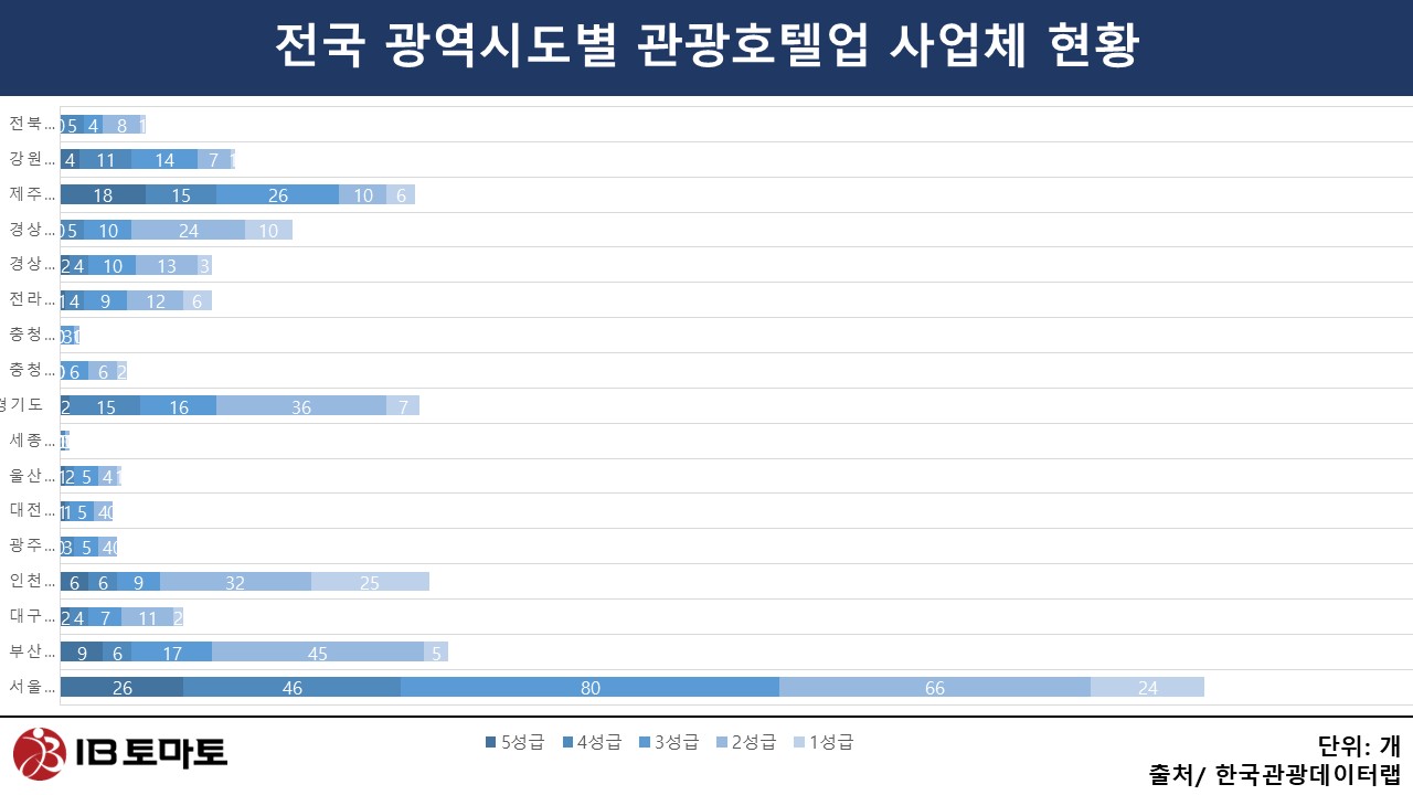 이 가운데 광주·세종·충북·충남·경남·전북 등 6개 지역 내 5성급 호텔이 없어 지역별 호텔 인프라 격차가 극심한 실정이다. 1성급부터 5성급까지 통틀어서 호텔이 가장 적은 지역은 세종으로 지역 내 4성급과 2성급 호텔 단 2개만 존재했다. 이어 충남(4개), 대전(11개), 광주(12개), 울산(13개), 충북(14개), 전북(18개)로 호텔 수가 적게 나타났다.