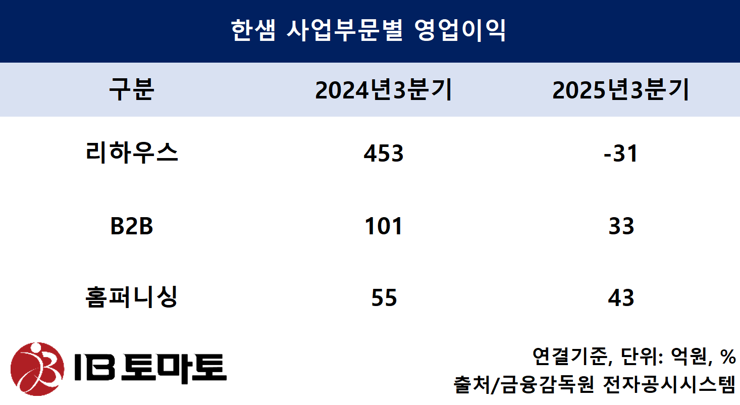 12일 금융감독원 전자공시시스템에 따르면 한샘은 올해 들어 리하우스 부문에서 지속적으로 영업손실을 내고 있다. 올해 3분기 리하우스 부문의 영업이익은 마이너스 31억원으로 지난해 동기(453억원) 대비 적자전환했다.