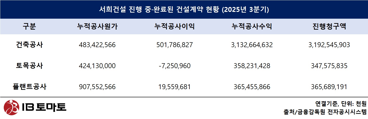 실제 수치로 보더라도 플랜트 부문의 한계는 분명해 보인다. 올해 3분기 기준 서희건설의 건설계약 기준 누적공사수익(공사진행률 적용액)은 3조 8563억원으로, 이 가운데 플랜트 공사에서 인식된 누적공사수익은 3655억원에 그쳤다. 이는 전체 누적공사수익의 10% 안팎에 해당하는 수준이다. 누적공사수익은 공사 진행률에 따라 실제로 인식된 매출을 누계한 회계 계정으로, 현재까지 수행된 사업 규모를 보여준다.