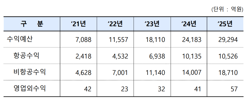 면세업계가 수익성 약화를 겪는 동안 인천공항의 매출은 가파른 성장세를 보였다. 특히 면세점 수익을 핵심으로 하는 비항공수익이 눈에 띄게 증가했다. 인천공항의 수익예산은 2023년 1조8110억원, 2024년 2조4183억원, 2025년 2조9294억원으로 증가했다. 수익예산이란 미래의 특정 기간 동안 예상되는 모든 수입을 미리 계획하고 정리한 재정 계획이다. 실제 지난해 연결 매출액(수익)은 2조6325억원으로 수익예산을 상회했다.