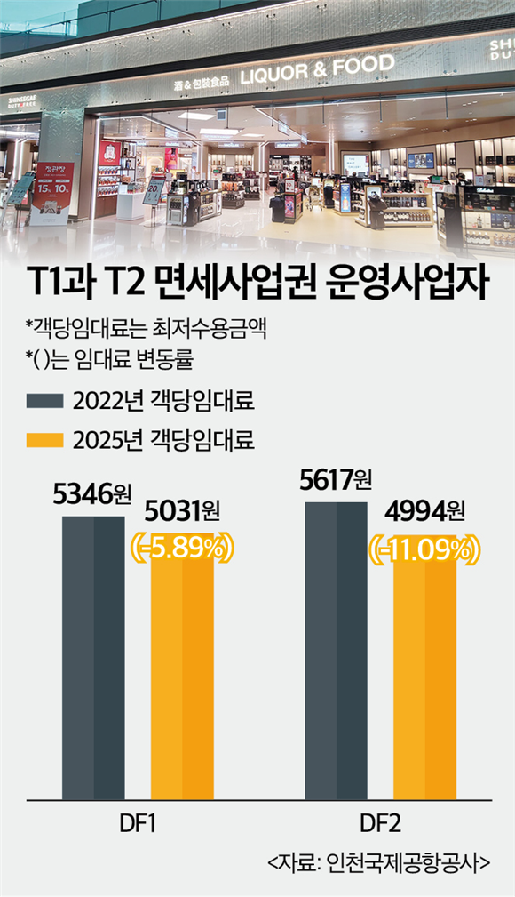 호텔신라(008770))이 임대료 인하를 요구하며 갈등이 깊어진 바 있다. 앞서 호텔신라는 지난 2023년 인천공항 제1·2여객터미널 면세점 중 DF1 임대료를 여객 1인당 8987원, 신세계 면세점은 DF2 임대료를 여객 1인당 9020원을 제시하면서 사업권을 따낸 것으로 알려졌다.