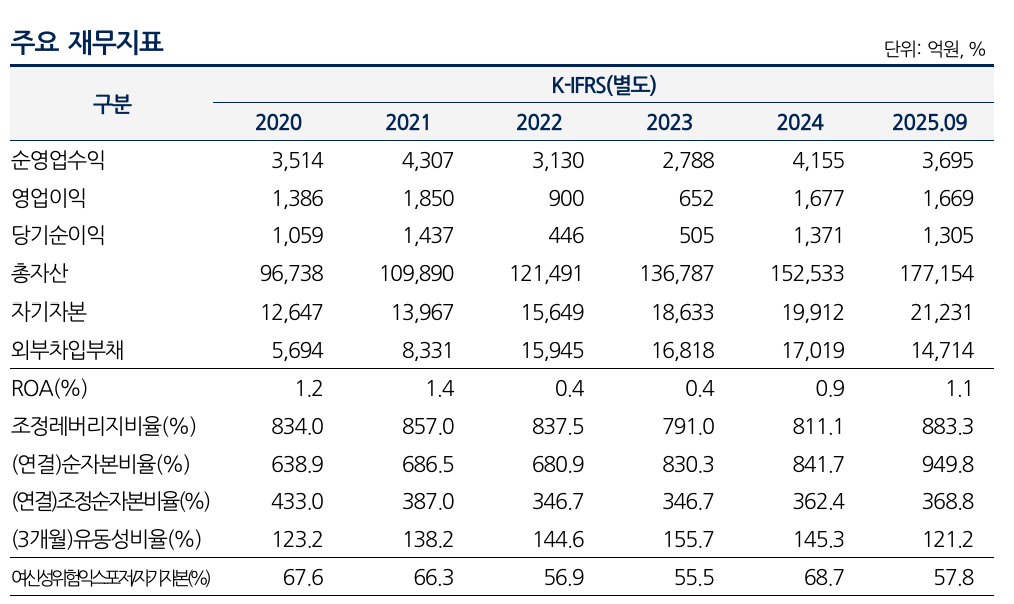 교보증권은 그간 부정적인 영업환경 속에서 수익성이 저하된 부분이 있으나 지난 2024년 이후 회복세로 전환했다. 2021년까지 위탁매매부문의 강세, 기업금융(IB) 부문 영업 확대로 ROA가 1%를 지속 상회하는 등 우수한 수익성을 창출했다. 2022년~2023년엔 위탁매매 부문 축소, IB부문 이익 감소 및 채무보증 충당금 전입 등으로 2년 연속 ROA 0.4%를 기록하는 등 낮은 수익성을 기록했으나 2024년엔 IB부문 이익 개선세, 금융부문 이익 확대 등에 힘입어 ROA 0.9%를 기록했다.