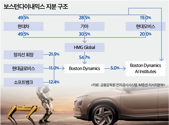 앞서 현대차그룹은 2021년 현대차(005380)(30%)와 현대모비스(012330)(20%), 현대글로비스(086280)(10%)를 앞세워 총 1조원에 보스턴다이내믹스 지분을 인수했다. 이후 2022년 미국 투자법인 HMG Global LLC를 설립하고 현대차·기아·현대모비스가 보유하던 지분을 일괄 이전했다. 보스턴다이내믹스의 주요 주주는 HMG글로벌(54.7%)과 정 회장(21.9%), 현대글로비스(11%), 소프트뱅크(9.5%) 등이다. 지난해 하반기 유상증자 이후 지분율에 소폭 변동이 있었으나 정 회장의 개인 지분을 포함한 현대차그룹이 전체 90%를 차지하고 있다. HMG글로벌은 현대차(49.5%)와 기아(000270)(30.5.5%), 현대모비스(20%)가 100% 지분을 보유한 미국 특수목적법인(SPC)이다.