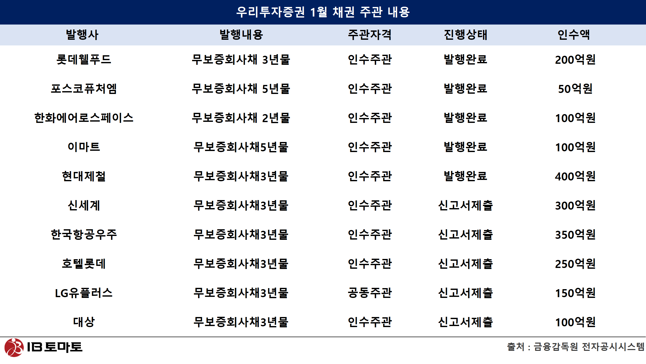 [IB토마토 최윤석 기자] 우리투자증권이 연초 회사채 주관 시장에서 빠르게 존재감을 키우고 있다. 올해 1월 19일까지 우리투자증권의 채권 주관 실적은 약 2000억원으로, 지난해 연간 주관 실적(5715억원)의 절반에 육박하는 수준이다. 기업금융(IB) 조직 정비를 마무리한 이후 본격적인 실적이 가시화되고 있다는 평가다. 그간 그룹 내에서 상대적으로 존재감이 크지 않았던 우리투자증권은, 최근 모험자본 공급 확대가 금융권 핵심 과제로 부상하면서 역할에 대한 기대감도 함께 커지고 있다.
